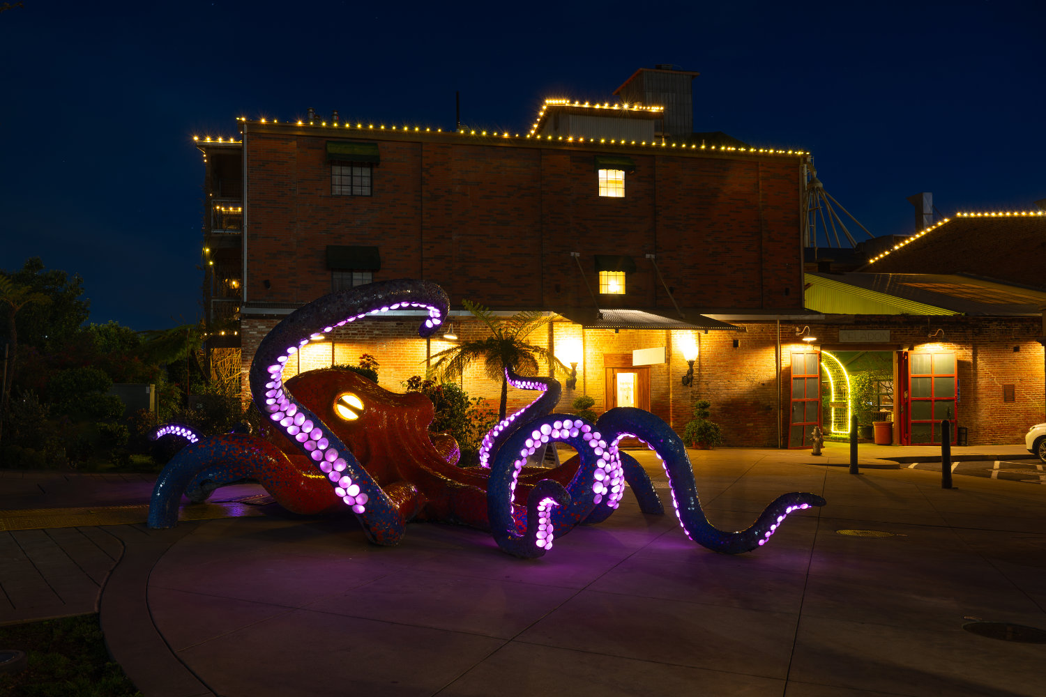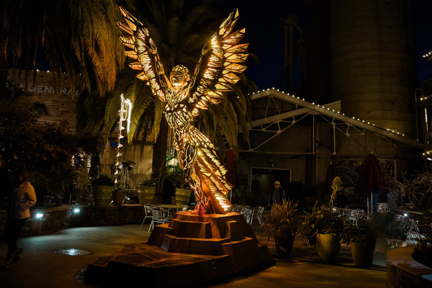 Witness stunning light displays at the iconic Historic Napa Mill, where contemporary art meets century-old architecture in playful and pretty immersive installations. Several pieces find their way to the Historic Mill and the river walk. Including the iconic Touch the Sky in 2024 by artist Martin Taylor of Oakland, California. This breathtaking statue was reminiscent of an archangel straight from the middle centuries.
